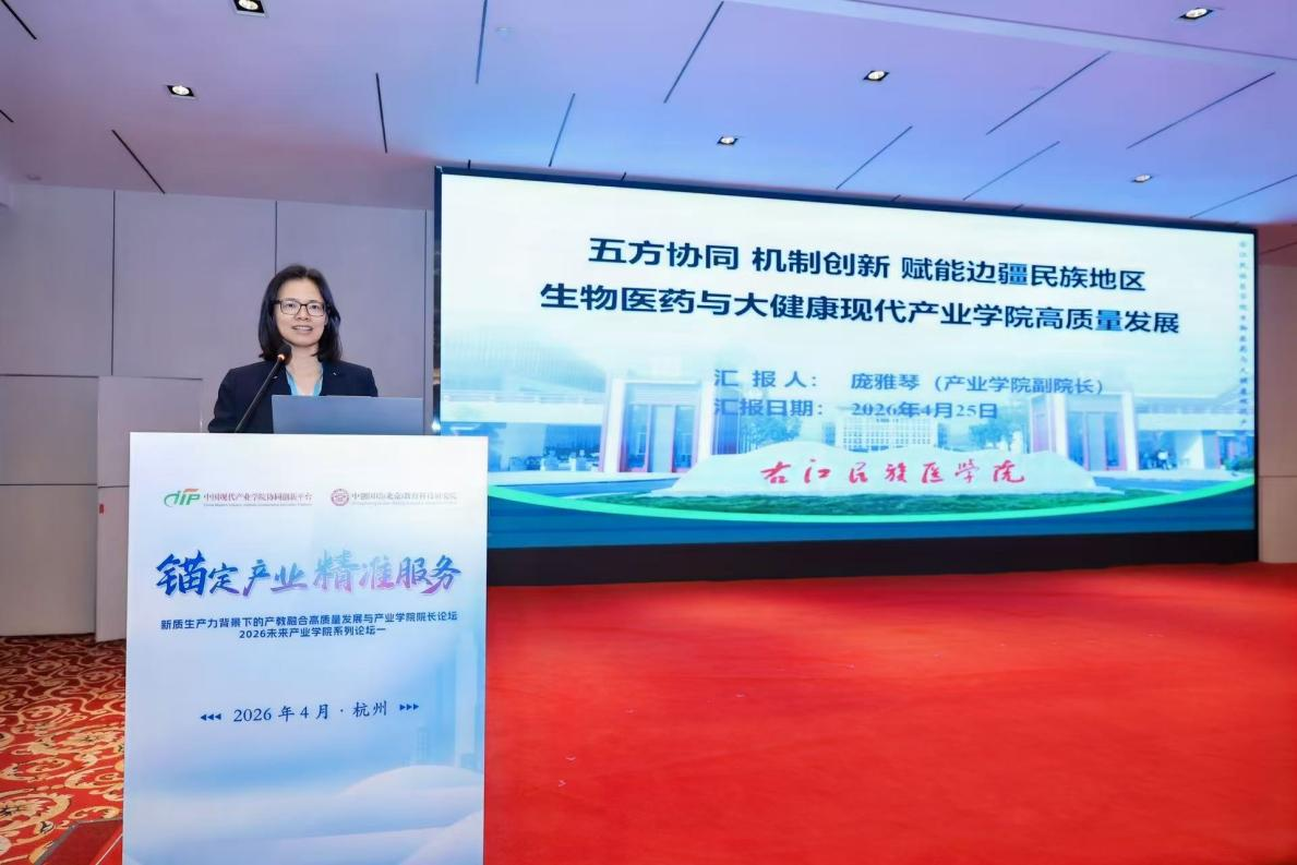 2026年4月24日至27日,由中国现代产业学院协同创新平台主办的“新质生产力背景下的产教融合高质量发展与产业学院院长论坛”在杭州举行。我校右江民族医学院医学技术与人工智能学院院长、生物医药与大健康现代产业学院副院长庞雅琴教授和宗子傲教授应邀参会并作专题报告。